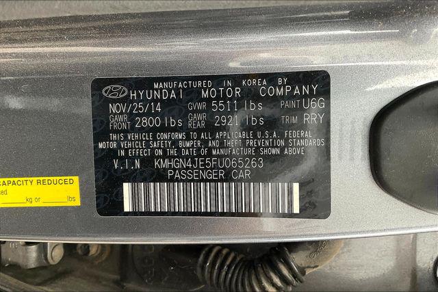 Clean CARFAX. Certified. Empire State Gray 2015 Hyundai Genesis 3.8 AWD 8-Speed Automatic with SHIFTRONIC 3.8L V6 DGI DOHC Dual CVVTHomer Skelton is committed to meeting your automotive needs with speed flexibility and friendly customer service.Certification Program Details: ENGINE: All internally lubricated parts. Engine block head(s) and intake/exhaust manifolds if damaged as a result of the mechanical failure of an internally lubricated part. Fuel pump and water pump. Fluids seals/gaskets only when required with the replacement of a covered component(s)/part(s). TRANSMISSION/TRANSFER CASE: All internally lubricated parts. Gear cases and housings if damaged as the result of the mechanical failure of an internally lubricated part. Torque converter vacuum modulator valve. Fluids seals/gaskets only when required with the replacement of a covered component(s)/part(s). DRIVE AXLE: All internally lubricated parts. Gear cases and housings if damaged as the result of the mechanical failure of an internally lubricated part. Axle shafts and bearings C.V. and universal joints propeller shafts. Fluids seals/gaskets only when required with the replacement of a covered component(s)/parts(s). PLUS...24-HOUR EMERGENCY ROADSIDE SERVICE Provides towing assistance; dead battery service; flat tire assistance; fuel oil and water delivery service; and lockout service expenses up to $50 per occurrence for 12 months from the vehicle sale date.Option Group 03 Signature Package 02 (Auto-Dimming Outside Mirrors Blind Spot Detection System HID Headlights w/Auto-Leveling Integrated Memory System (IMS) Parking Guidelines Power Heated/Cooled Front Bucket Seats Power Rear Sunshade Power Tilt-and-Slide Panoramic Sunroof Power Tilt-and-Telescopic Steering Wheel and Radio: AM/FM/HD/SiriusXM/CD/DVD/MP3 Audio System) Technology Package 03 (7"" TFT LCD Cluster Display Automatic Emergency Braking (AEB) Electronic Parking Brake w/Automatic Vehicle Hold Front & Rear Parking Assistance System Haptic Feedback Steering Wheel High Beam Assist Lane Departure Warning System (LDWS) Lane Keep Assist Power Heated & Cooled Front Bucket Seats Pre-Safe ty Seatbelt Smart Cruise Control and Ultra-Premium Leather Seating Surfaces) 4-Wheel Disc Brakes 7 Speakers ABS brakes Air Conditioning All Weather Floor Mats Alloy wheels AM/FM radio: SiriusXM Anti-whiplash front head restraints Auto-dimming Rear-View mirror Automatic temperature control Bodyside moldings Brake assist Bumpers: body-color CD player Compass Delay-off headlights Driver door bin Driver vanity mirror Dual front impact airbags Dual front side impact airbags Electronic Stability Control Emergency communication system: Blue Link Exterior Parking Camera Rear First Aid Kit Four wheel independent suspension Front anti-roll bar Front Bucket Seats Front Center Armrest w/Storage Front dual zone A/C Front reading lights Fully automatic headlights Garage door transmitter: HomeLink Heated door mirrors Heated front seats Heated rear seats Heated steering wheel Illuminated entry Knee airbag Leather Seating Surfaces Leather steering wheel Low tire pressure warning Navigation System Occupant sensing airbag Option Group 02 Outside temperature display Overhead airbag Overhead console Panic alarm Passenger door bin Passenger vanity mirror Power door mirrors Power driver seat Power Heated Front Bucket Seats Power passenger seat Power steering Power windows Radio: AM/FM/SiriusXM/HD/CD/MP3 Audio System Rain sensing wipers Rear anti-roll bar Rear Bumper Applique Rear reading lights Rear seat center armrest Rear side impact airbag Rear window defroster Remote keyless entry Security system Speed control Speed-sensing steering Speed-Sensitive Wipers Steering wheel mounted audio controls Tachometer Telescoping steering wheel Tilt steering wheel Traction control Trip computer Turn signal indicator mirrors Variably intermittent wi